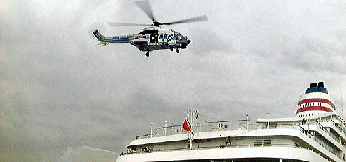| 「うみたか」が客船「飛鳥」に接近し、担架を下ろします。そこへ甲板で待ち構えた隊員が、負傷者を担架に乗せて、吊り上げ収容します。 |